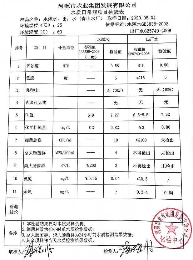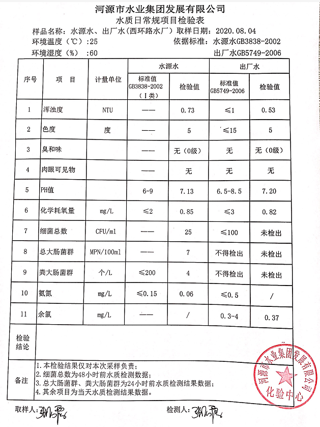 2020年8月4日水質(zhì)檢驗(yàn)報告