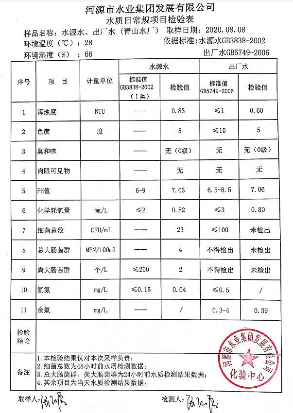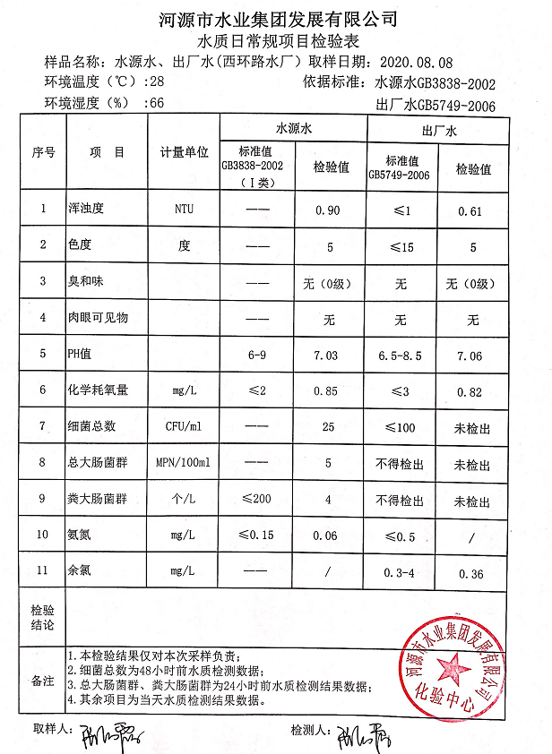 2020年8月8日水質(zhì)檢驗(yàn)報告