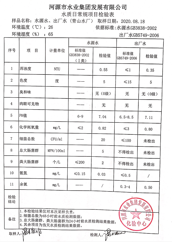 2020年8月18日水質(zhì)檢驗(yàn)報告