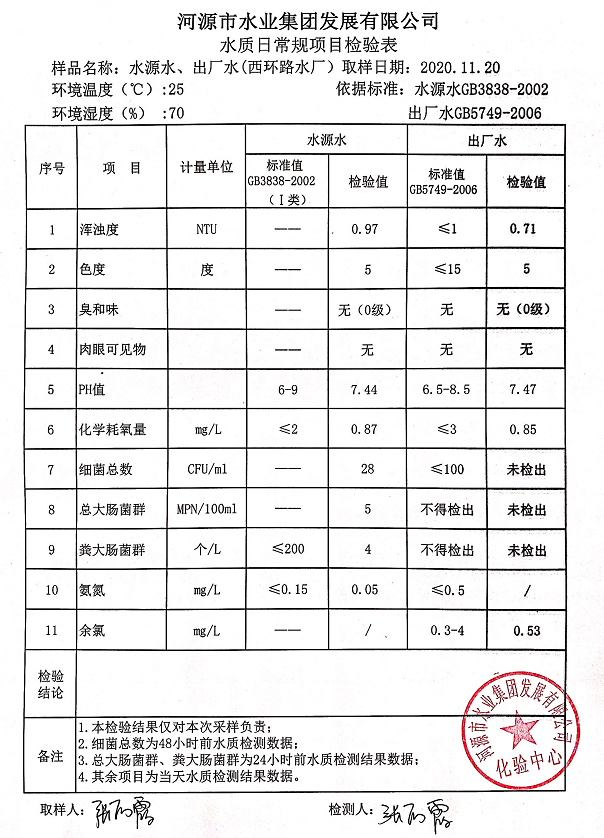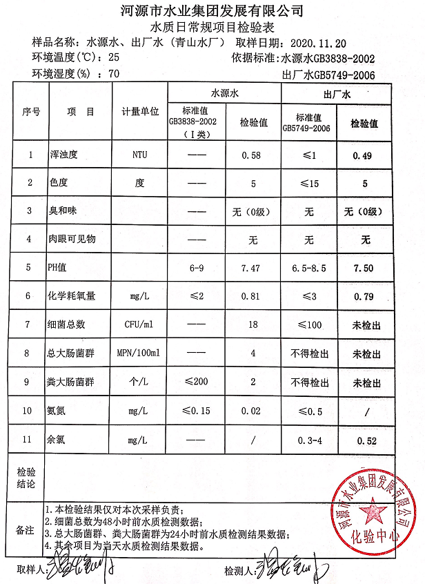2020年11月20日水質(zhì)檢驗(yàn)報告
