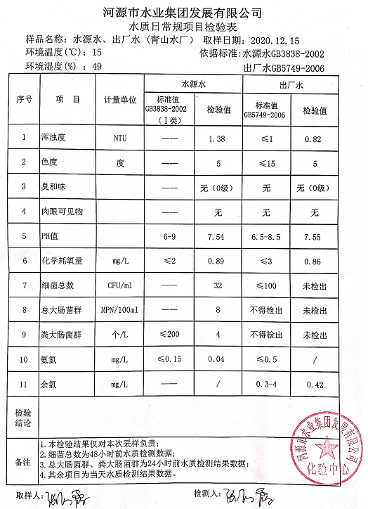 2020年12月15日水質(zhì)檢驗(yàn)報(bào)告
