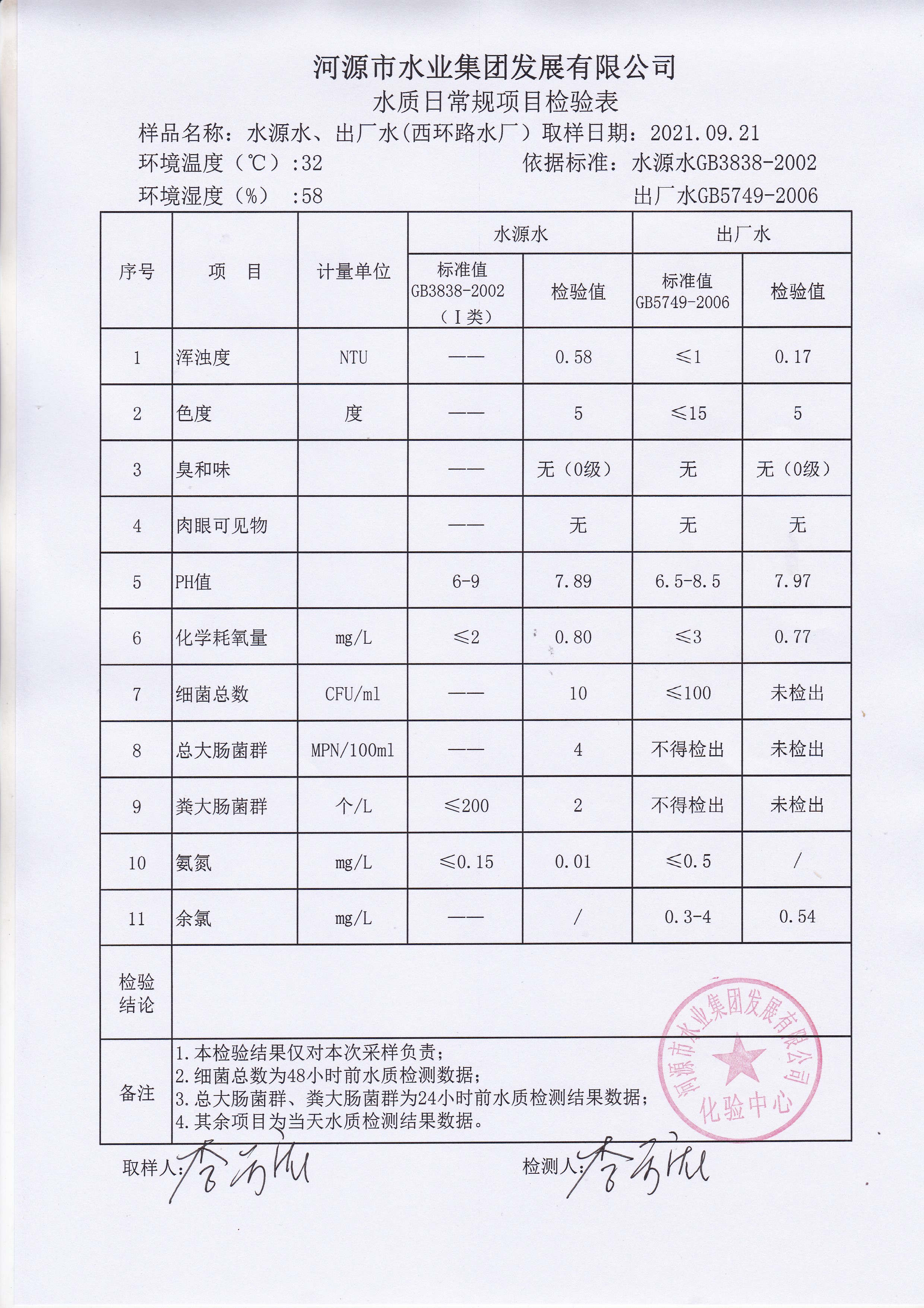 2021年9月21日水質檢驗報告
