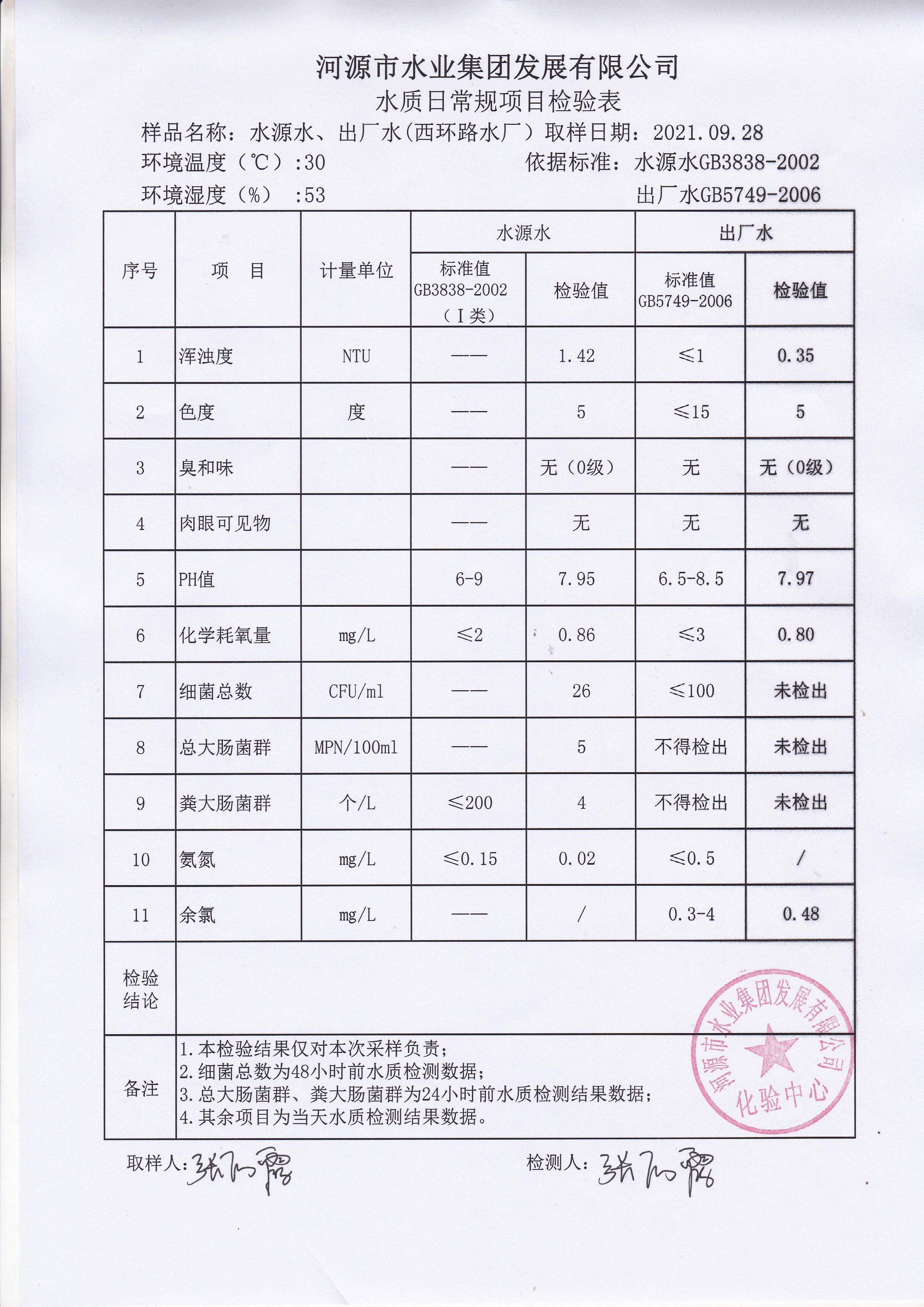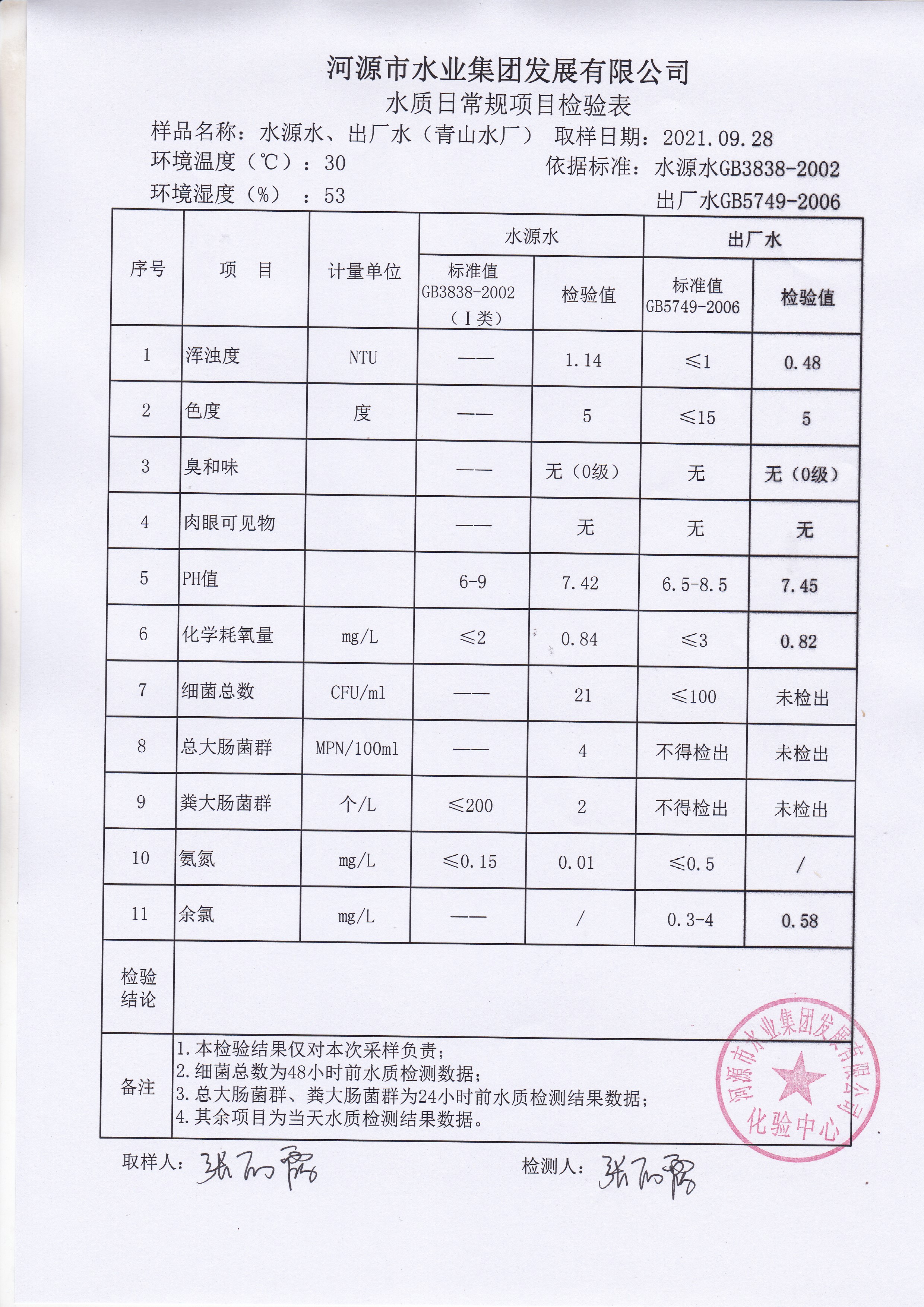 2021年9月28日水質(zhì)檢驗(yàn)報(bào)告