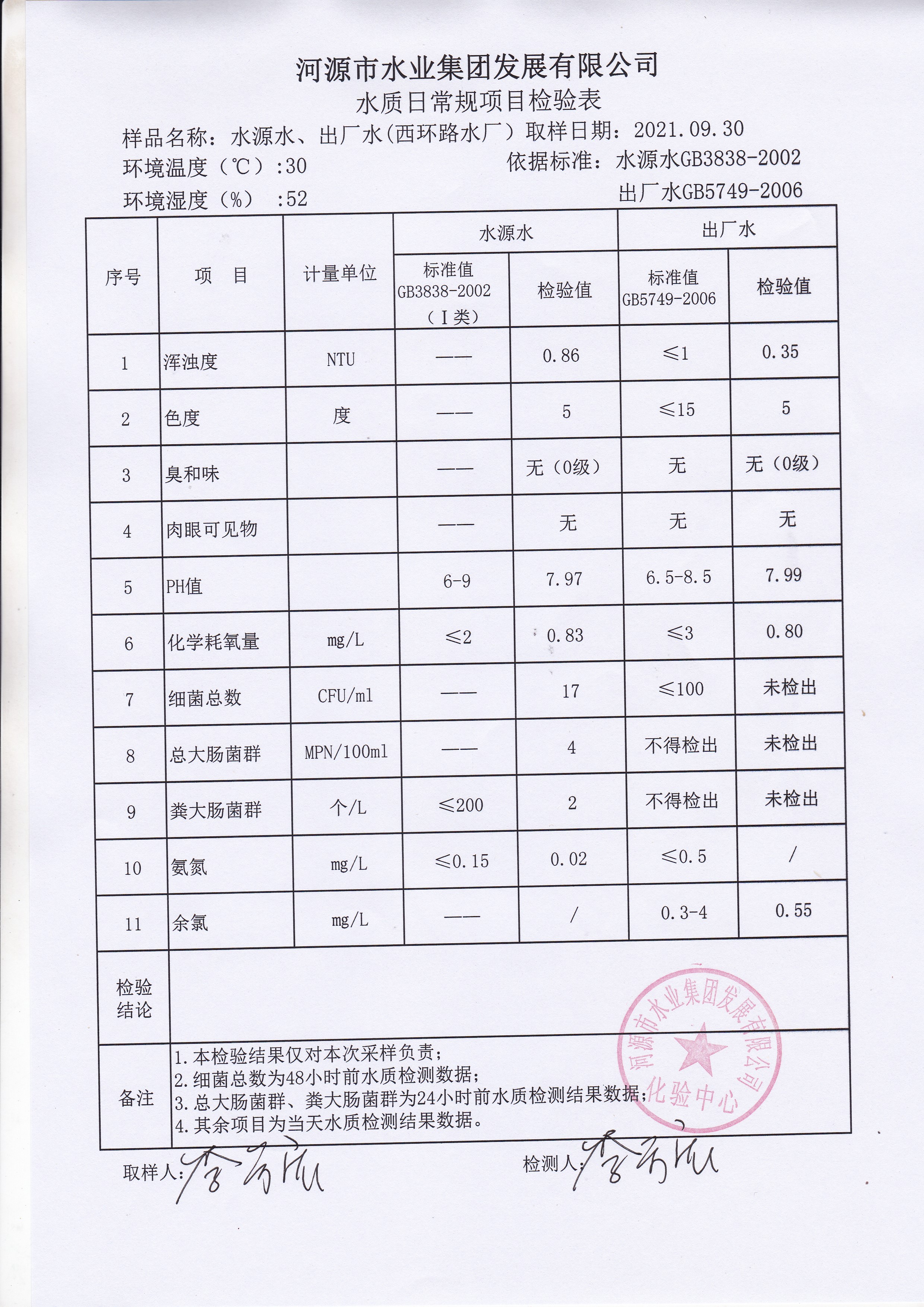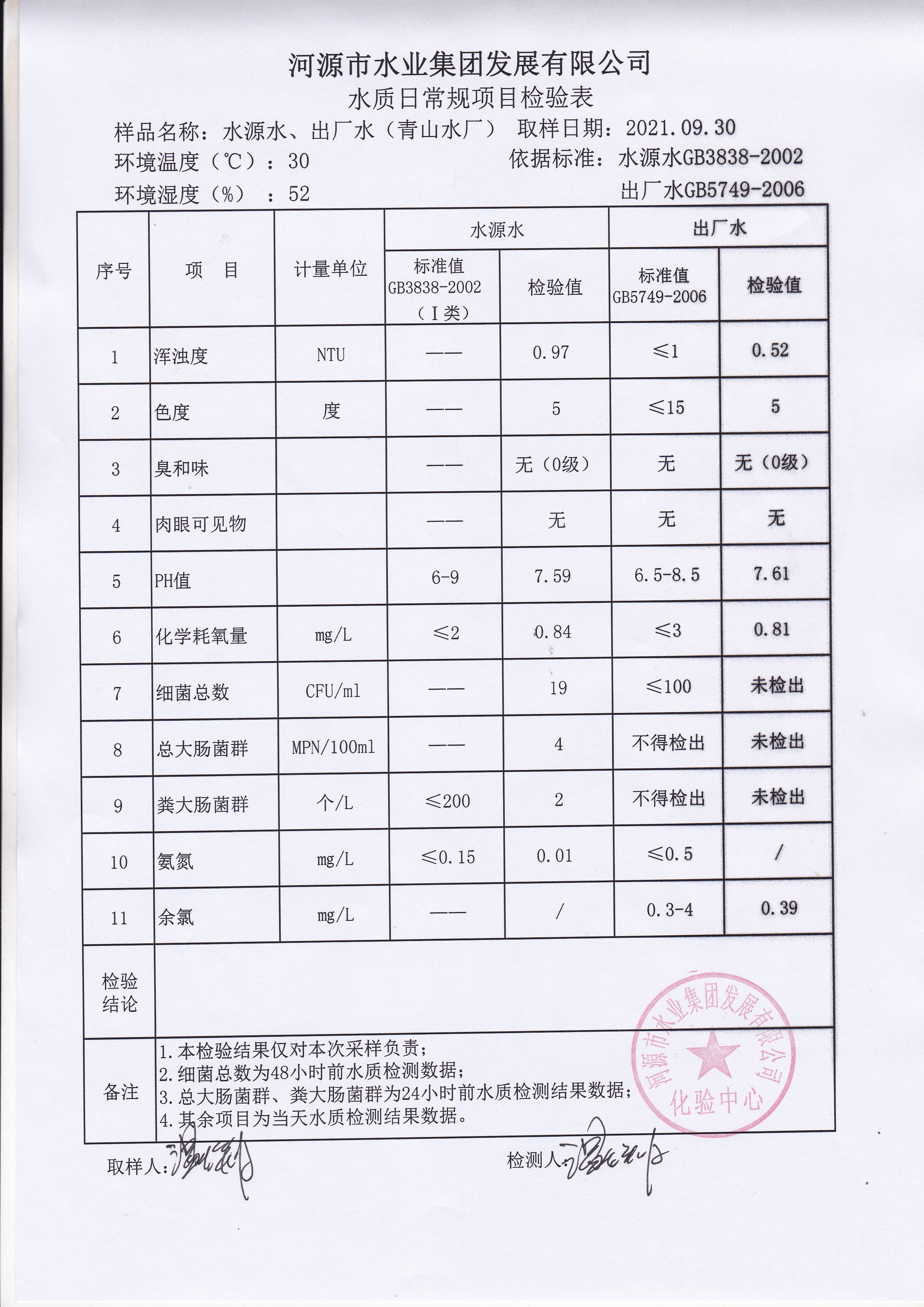 2021年9月30日水質(zhì)檢驗(yàn)報告
