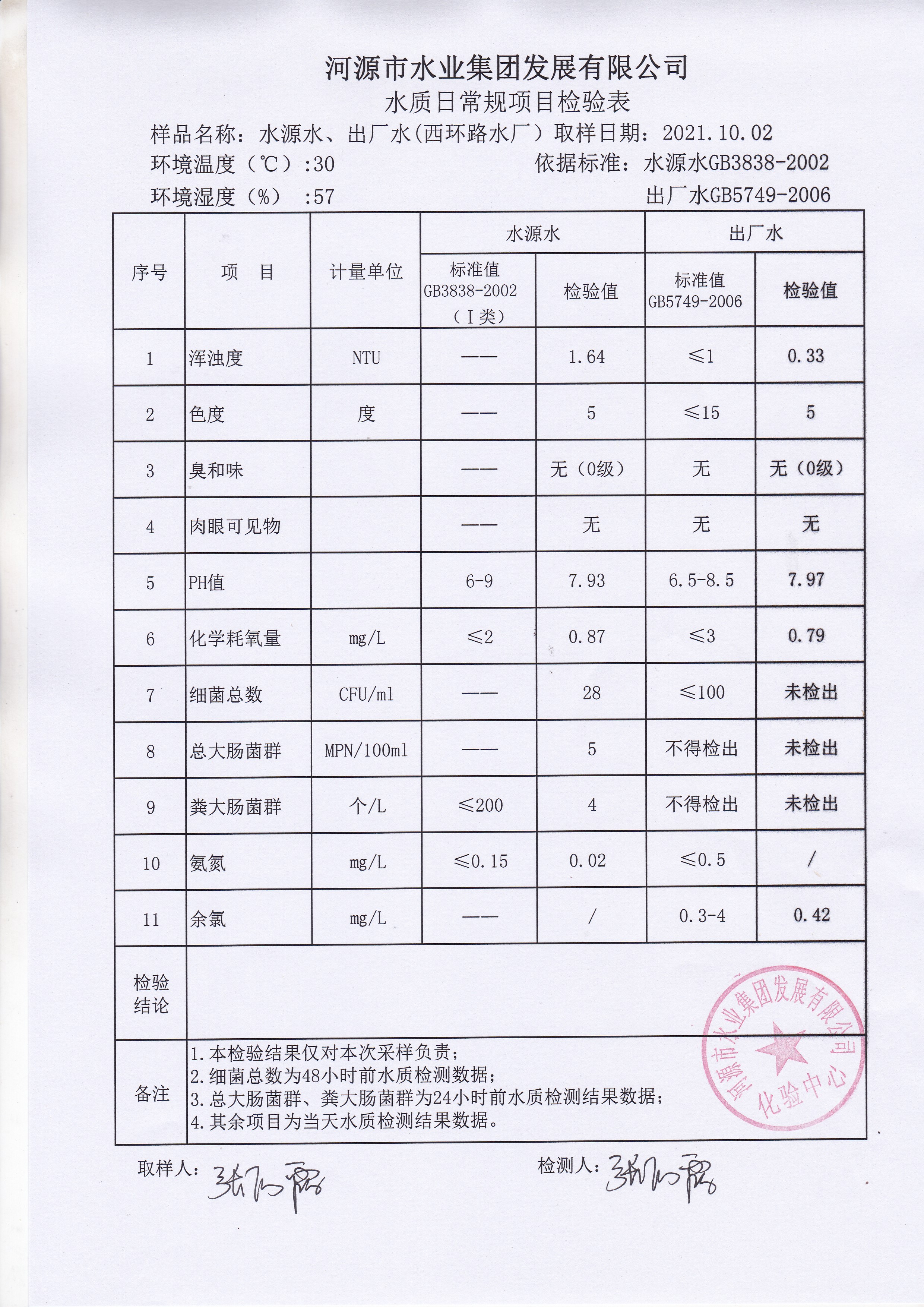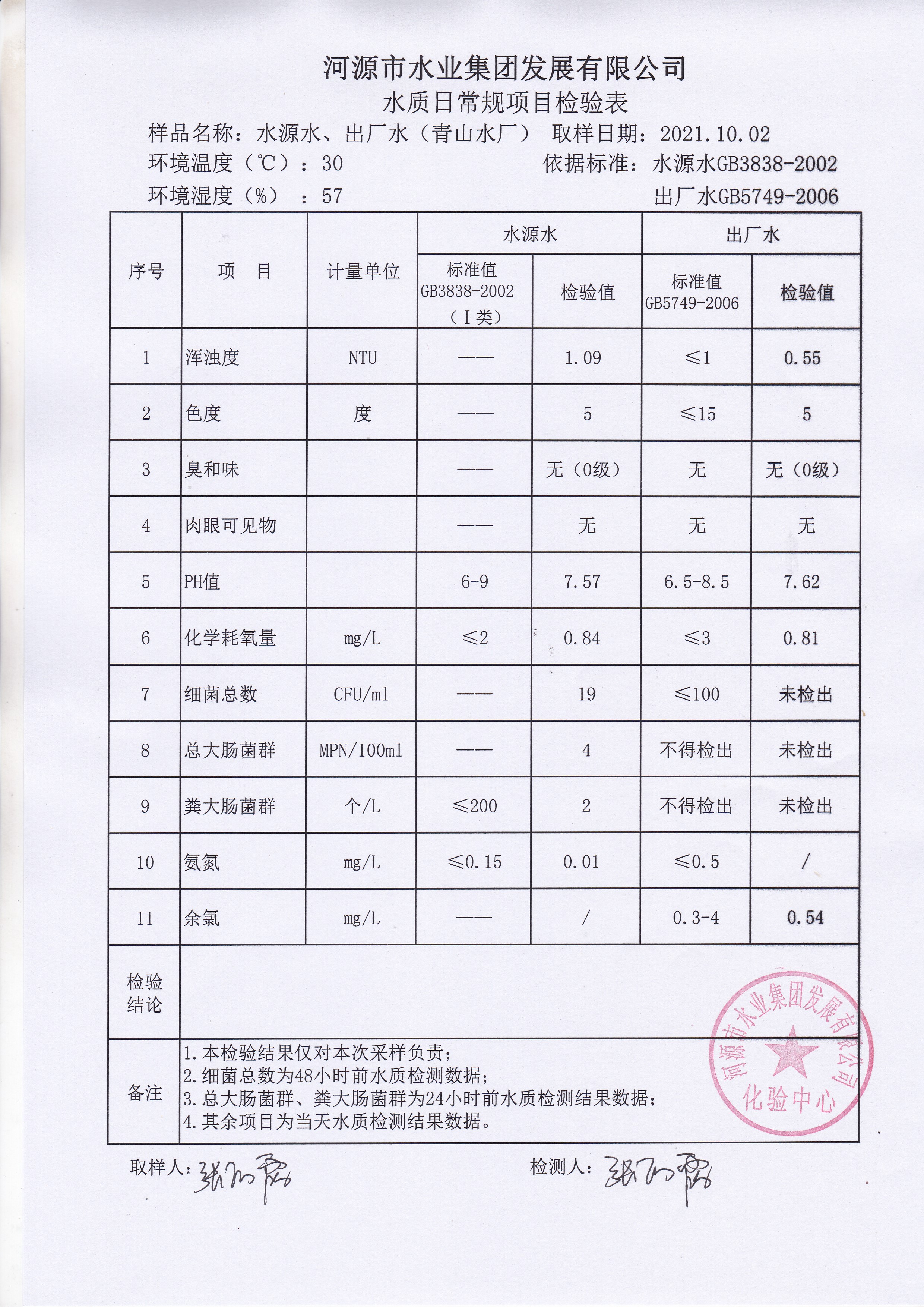 2021年10月2日水質(zhì)檢驗報告