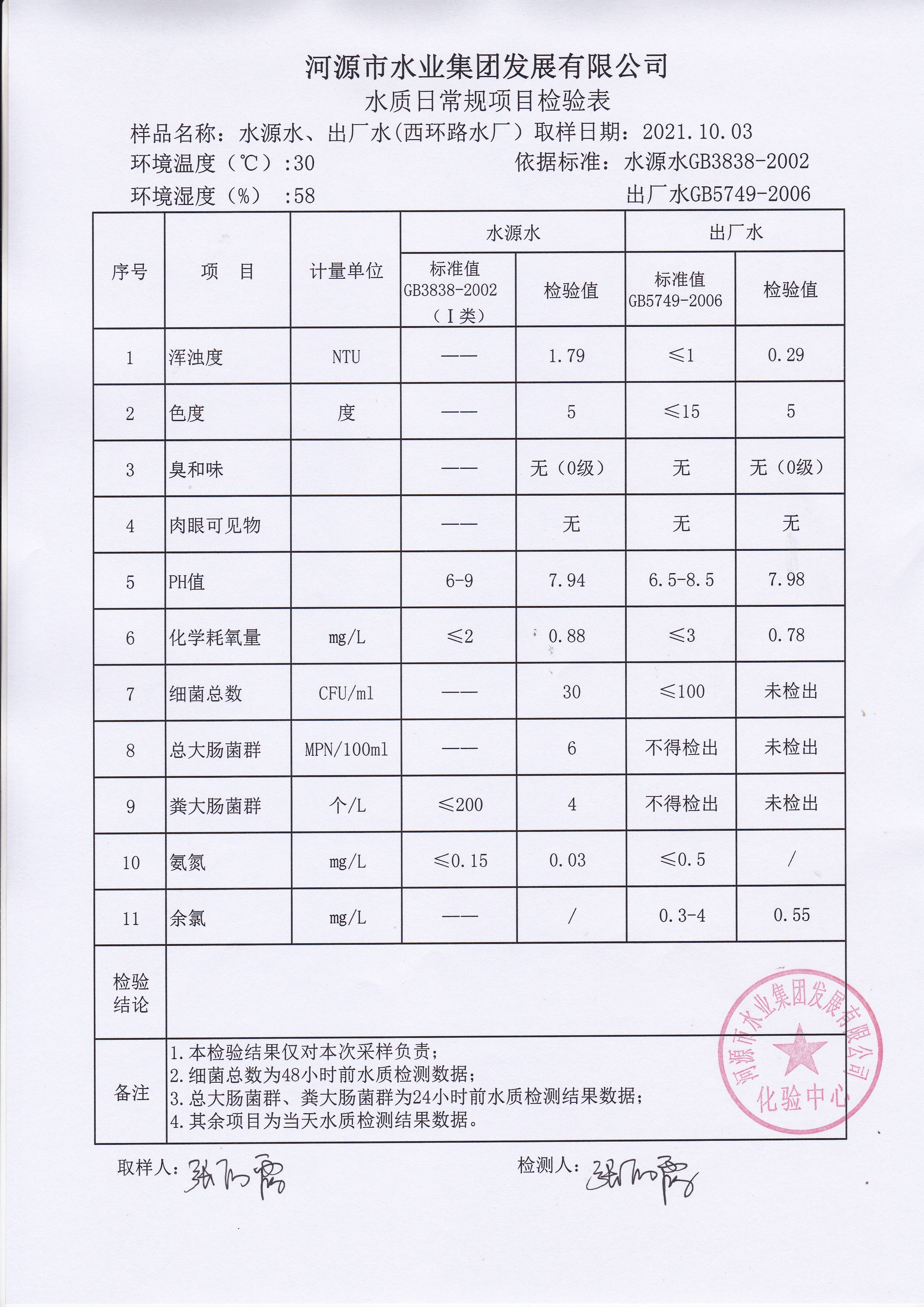 2021年10月3日水質(zhì)檢驗(yàn)報(bào)告