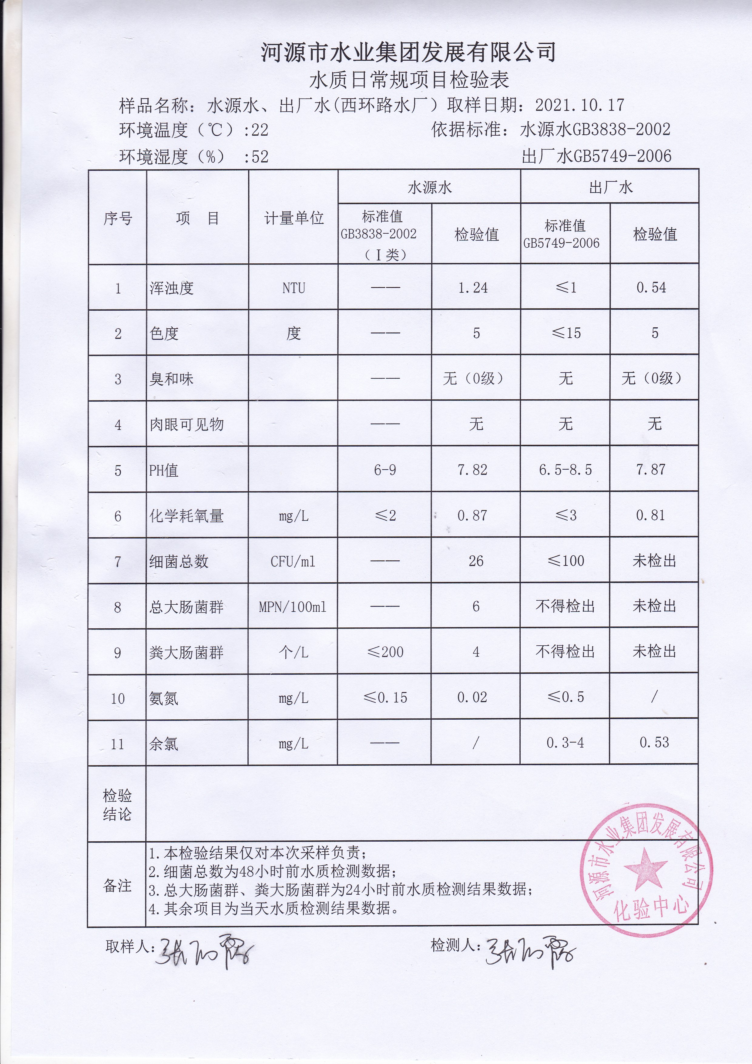 2021年10月17日水質(zhì)檢驗報告