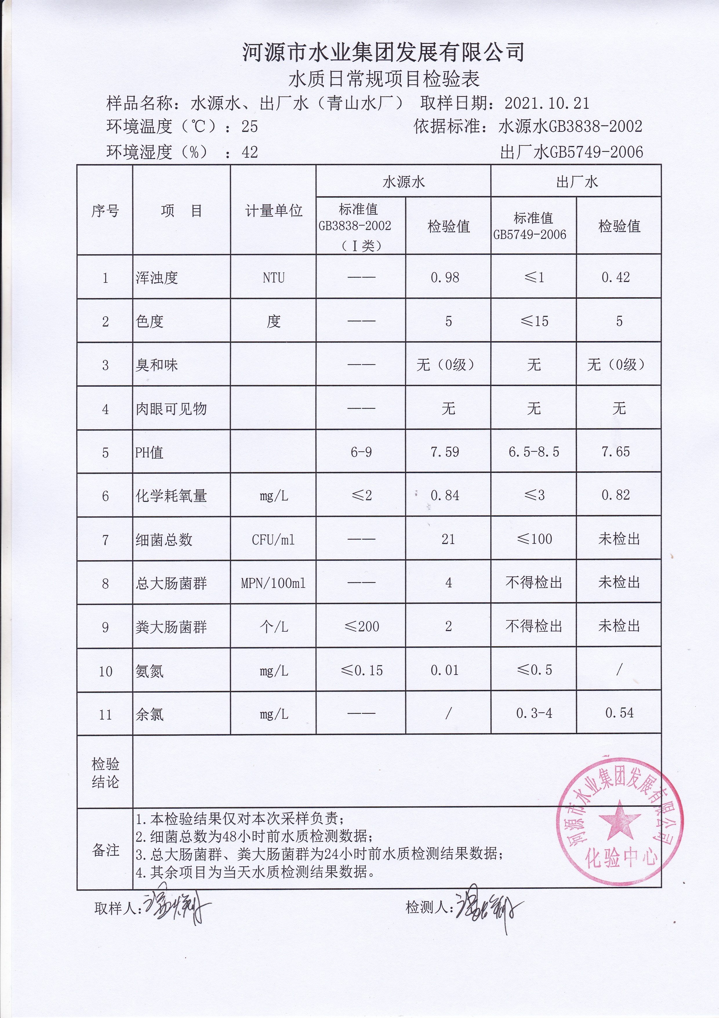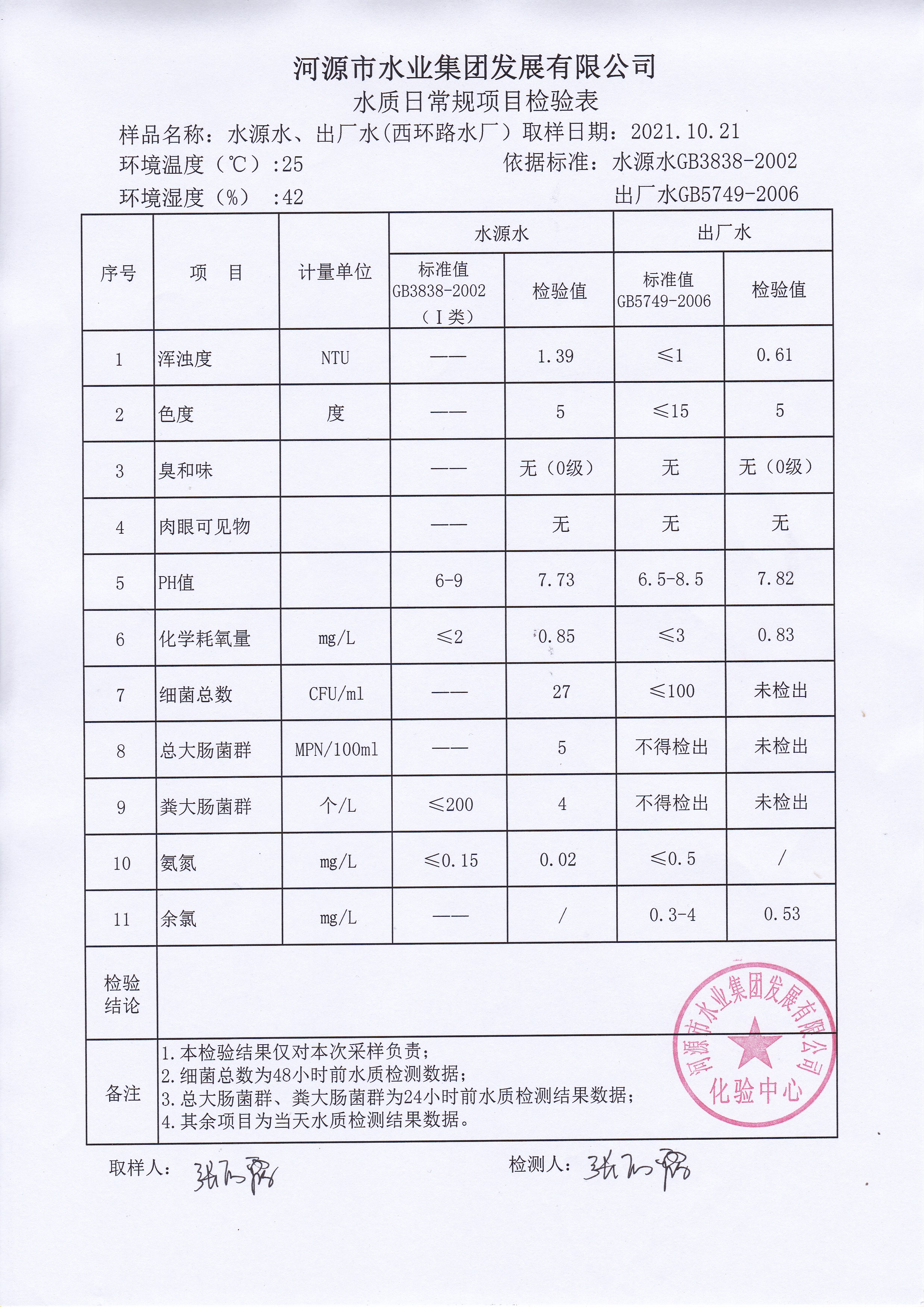 2021年10月21日水質檢驗報告