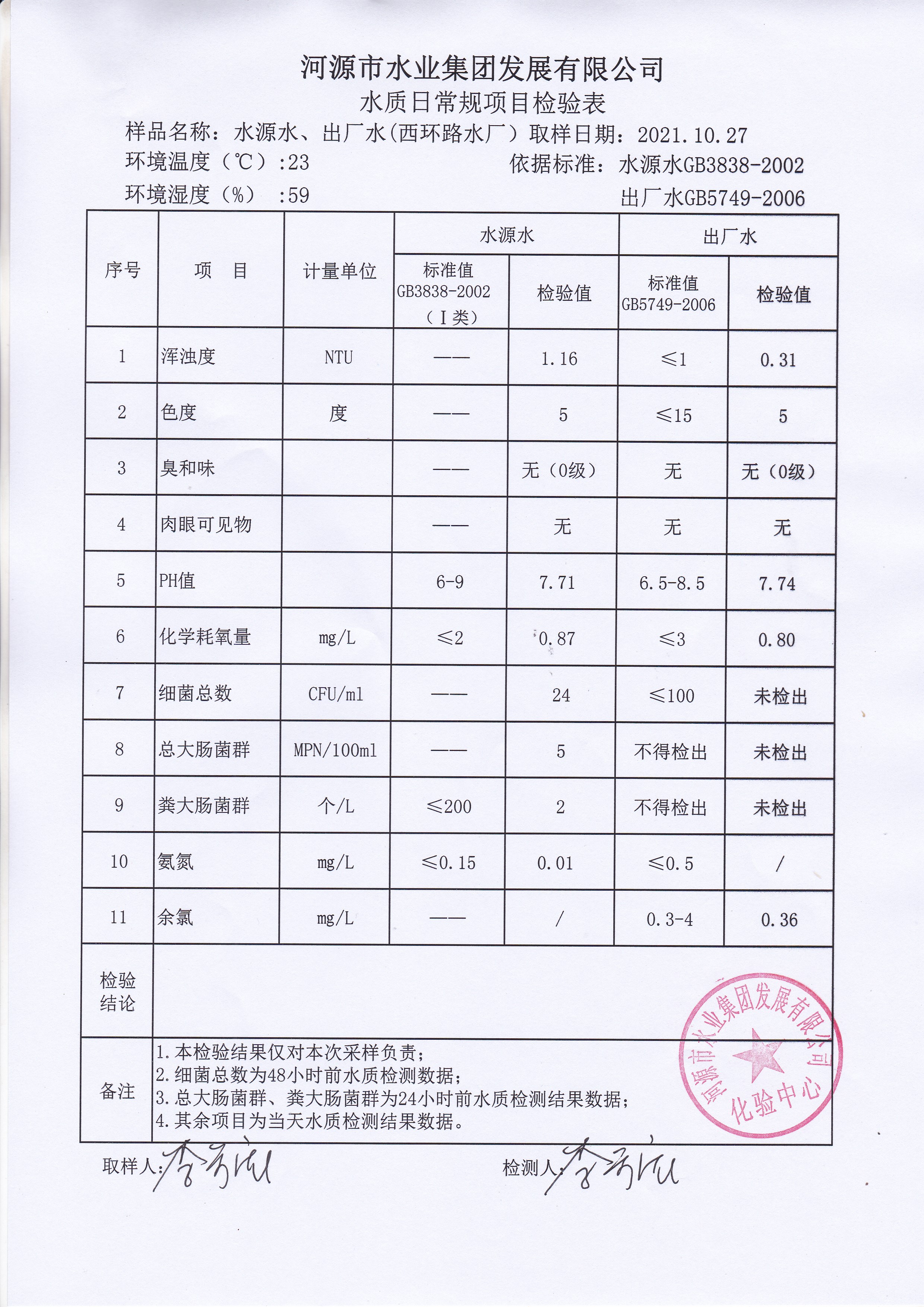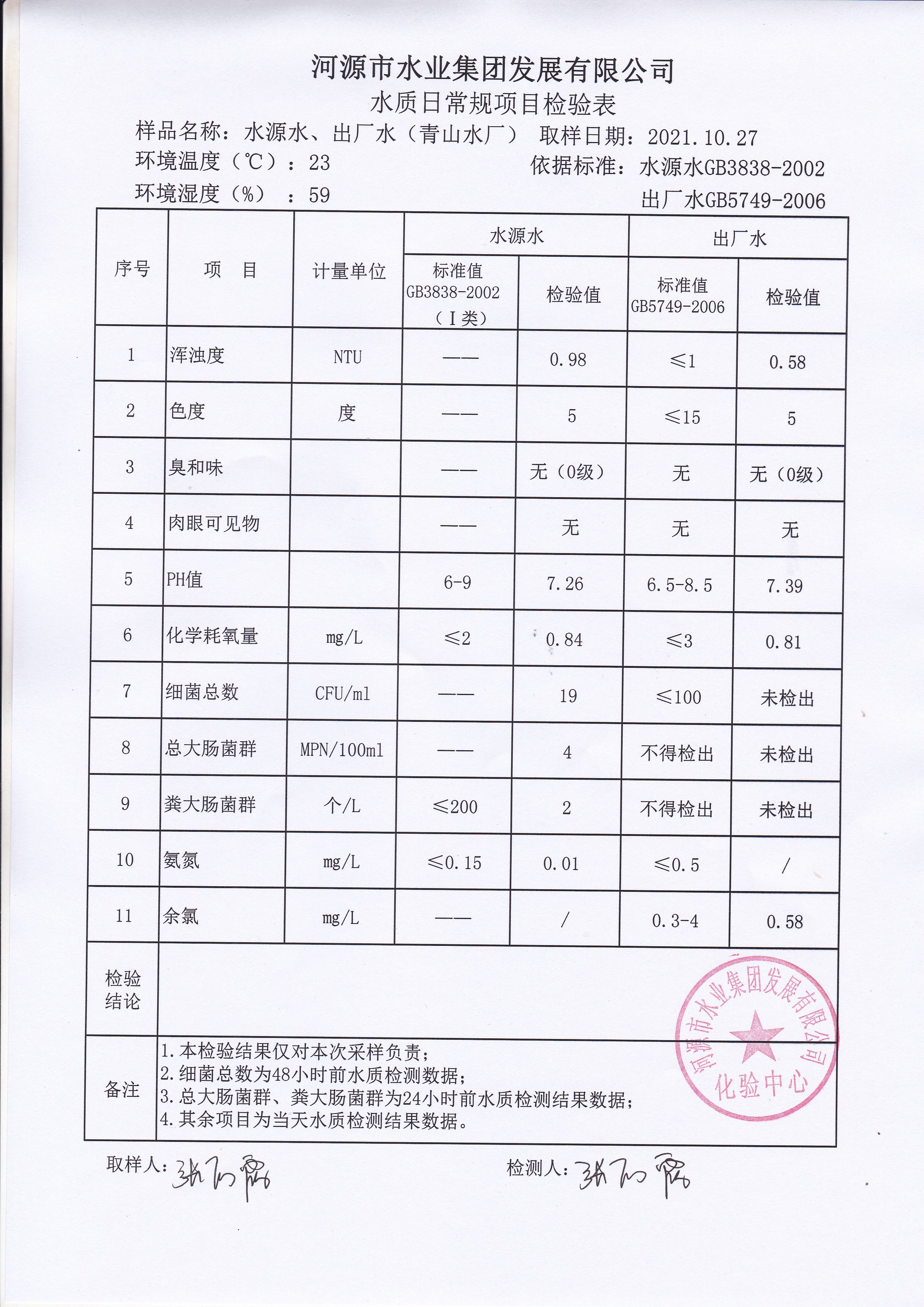 2021年10月27日水質(zhì)檢驗報告