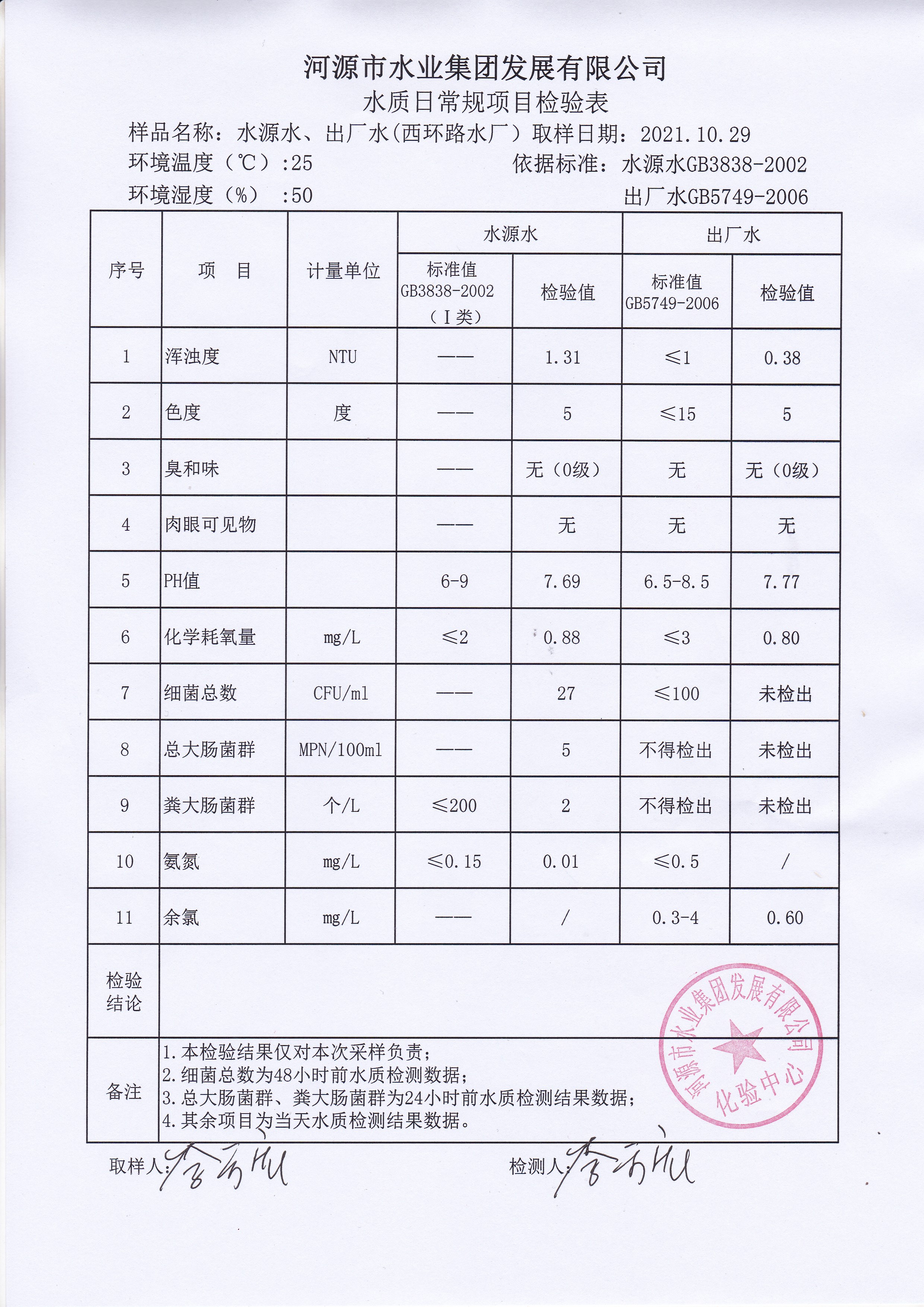 2021年10月29日水質(zhì)檢驗報告