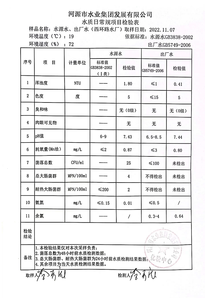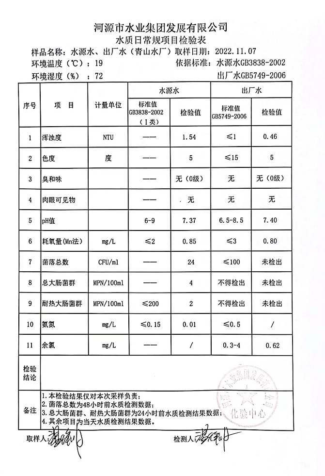 2022年11月7日水質(zhì)檢驗報告