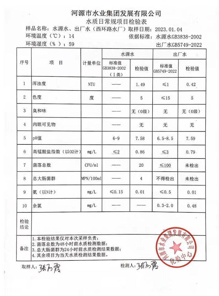 2023年1月4日水質(zhì)檢驗(yàn)報(bào)告