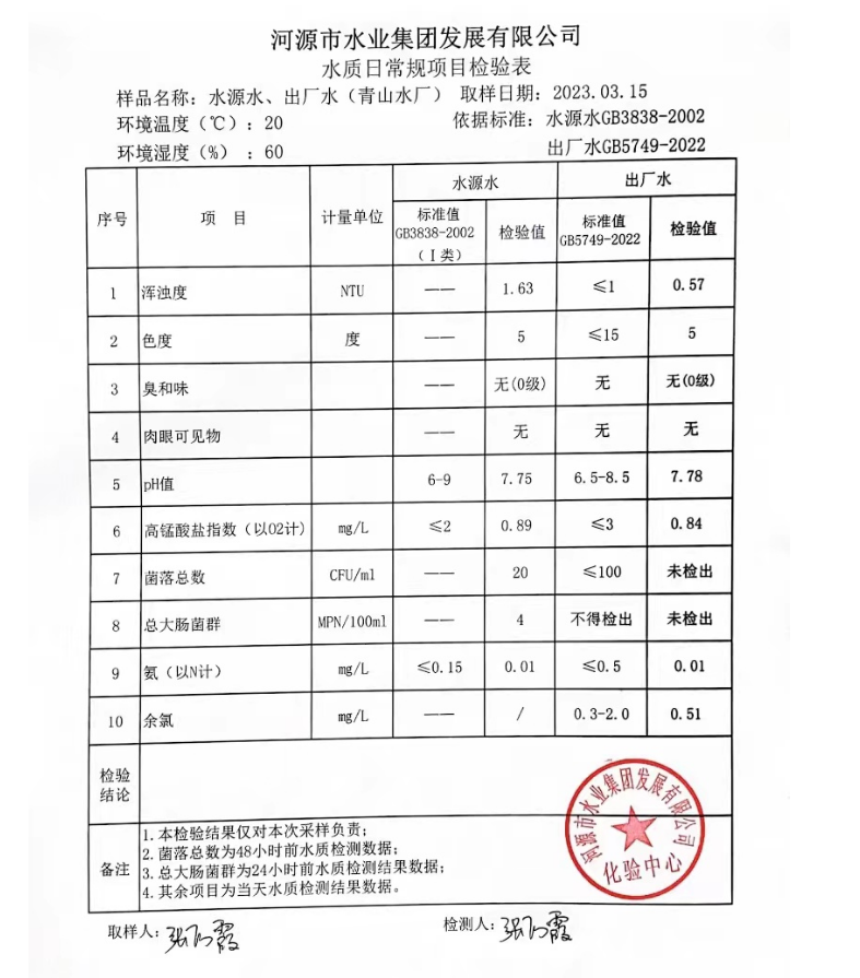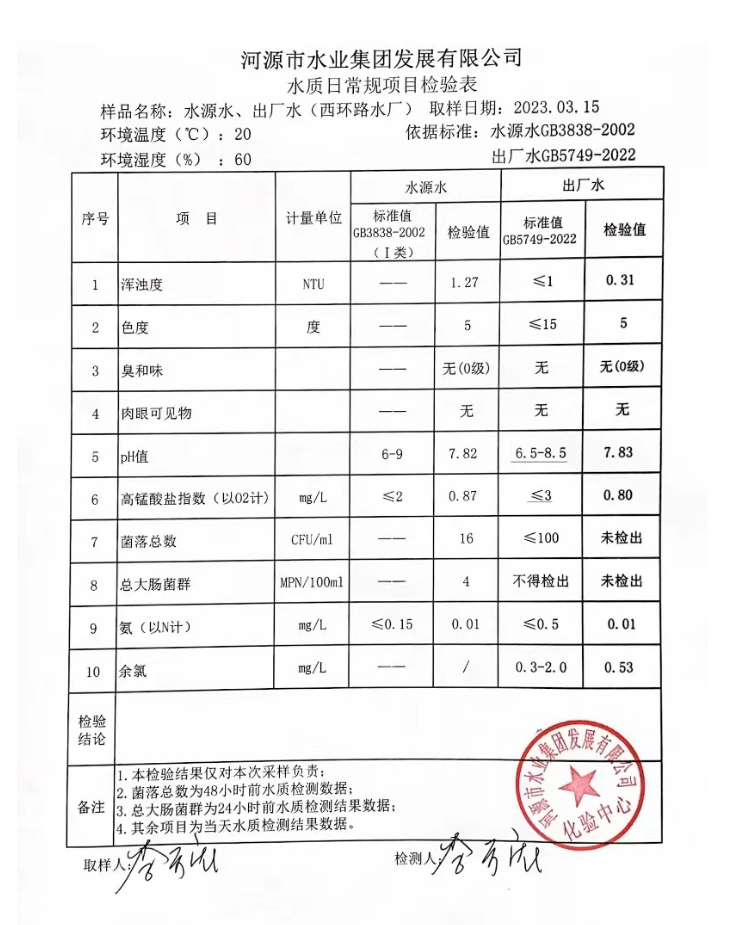 2023年3月15日水質(zhì)檢驗(yàn)報告