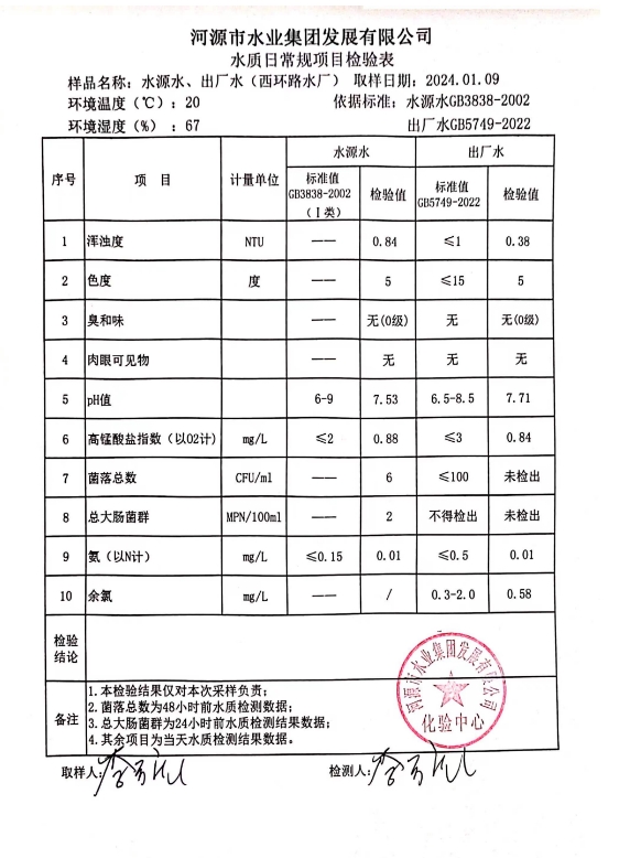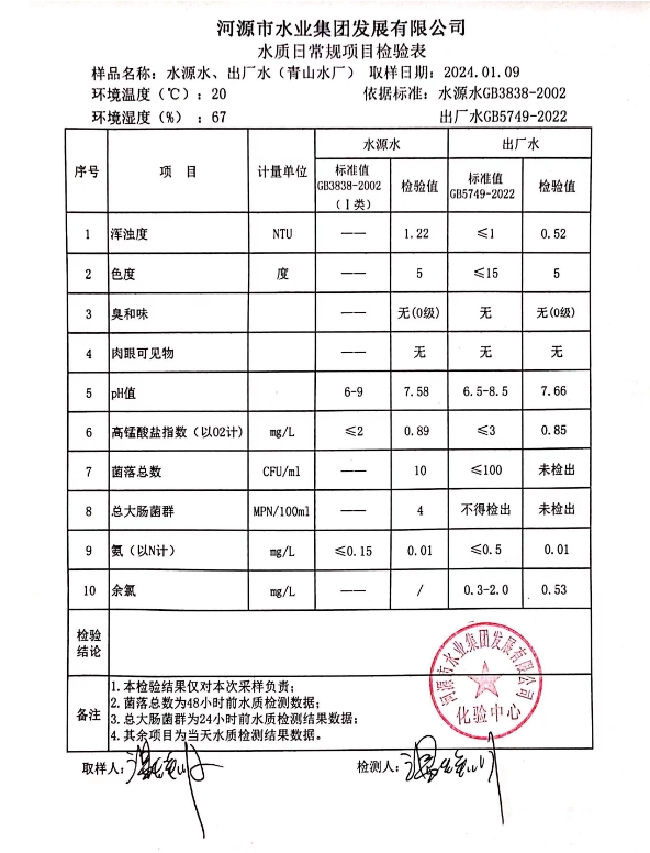 2024年1月9日水質(zhì)檢驗(yàn)報(bào)告
