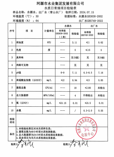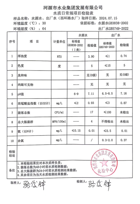 2024年7月15日水質(zhì)檢驗(yàn)報(bào)告