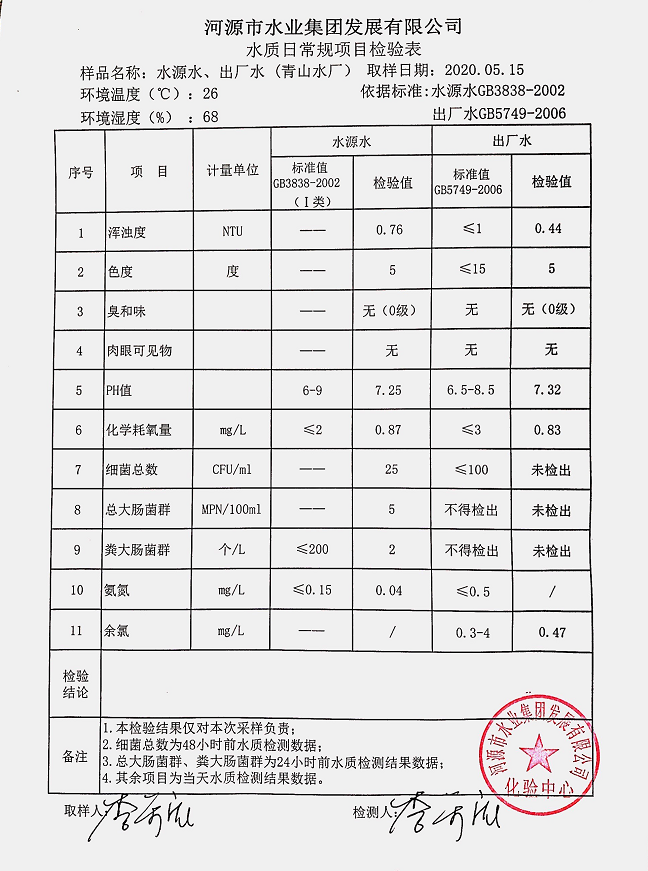 2020年5月15日水質(zhì)檢驗報告